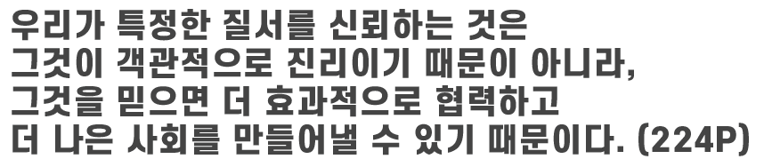 책에서 이 문장을 보고 아, 객관적 진리가 아니구나. 그저 서로 협력하기 위해 우리끼리 만들어낸 허구의 약속이구나 하고 새삼 와닿았어요. 그래서 독서노트로 남겨놓은 게 아닌가 싶습니다.