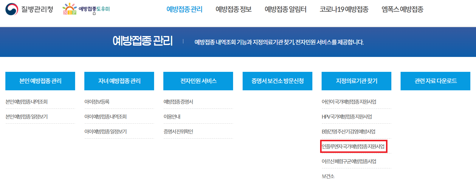 예방 접종도우미 누리집 → 지정의료기관 찾기→ 인플루엔자 국가예방접종 지원사업