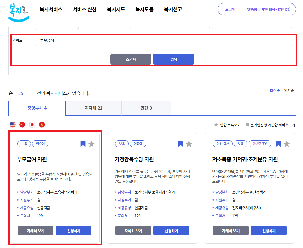 복지로의 서비스 목록에서 부모급여를 검색해 신청을 진행하시면 됩니다.