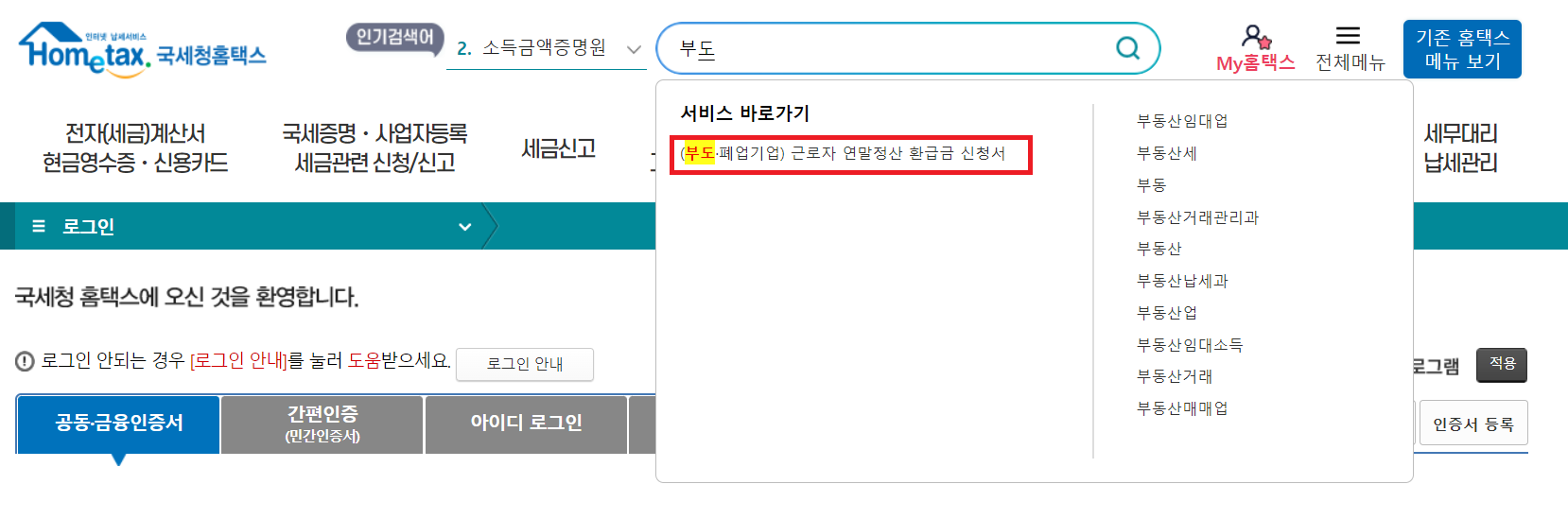 홈택스에서 부도를 검색하면 근로자 연말정산 환급금 지급을 신청하실 수 있습니다.