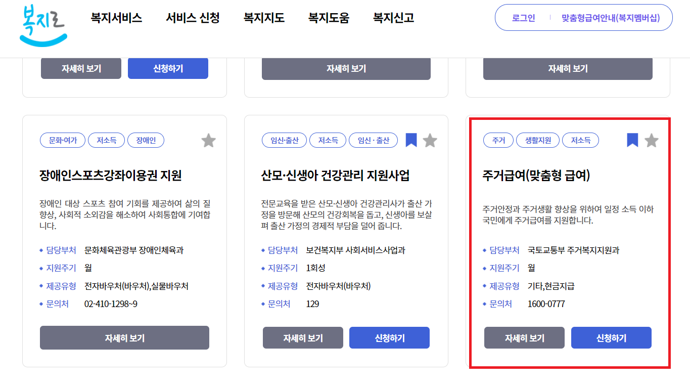 복지로 로그인하여 서비스 목록에서 주거급여를 검색해 찾아 신청하면 됩니다