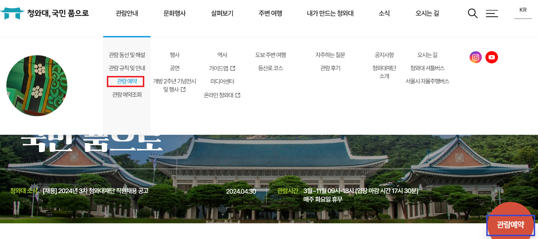 청와대 홈페이지 접속 후 '청와대 관람 예약' 메뉴를 선택합니다.